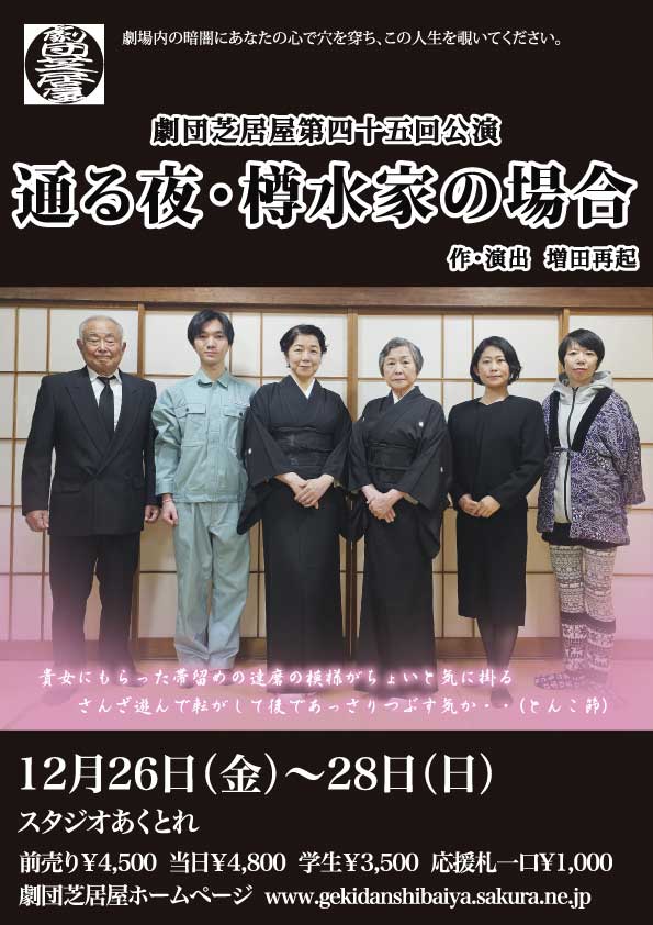 ☆゚+.☆゚+.☆゚+.☆゚+.☆゚ + MENU + ☆゚+.☆゚+.☆゚+.☆゚+.☆゚ **告知** 第45回公演 『通る夜・樽水家の場合』 2025年12月26日(金)〜28日(日) スタジオあくとれ 詳細は コチラから ☆゚+.☆゚+.☆゚+.☆゚+.☆゚